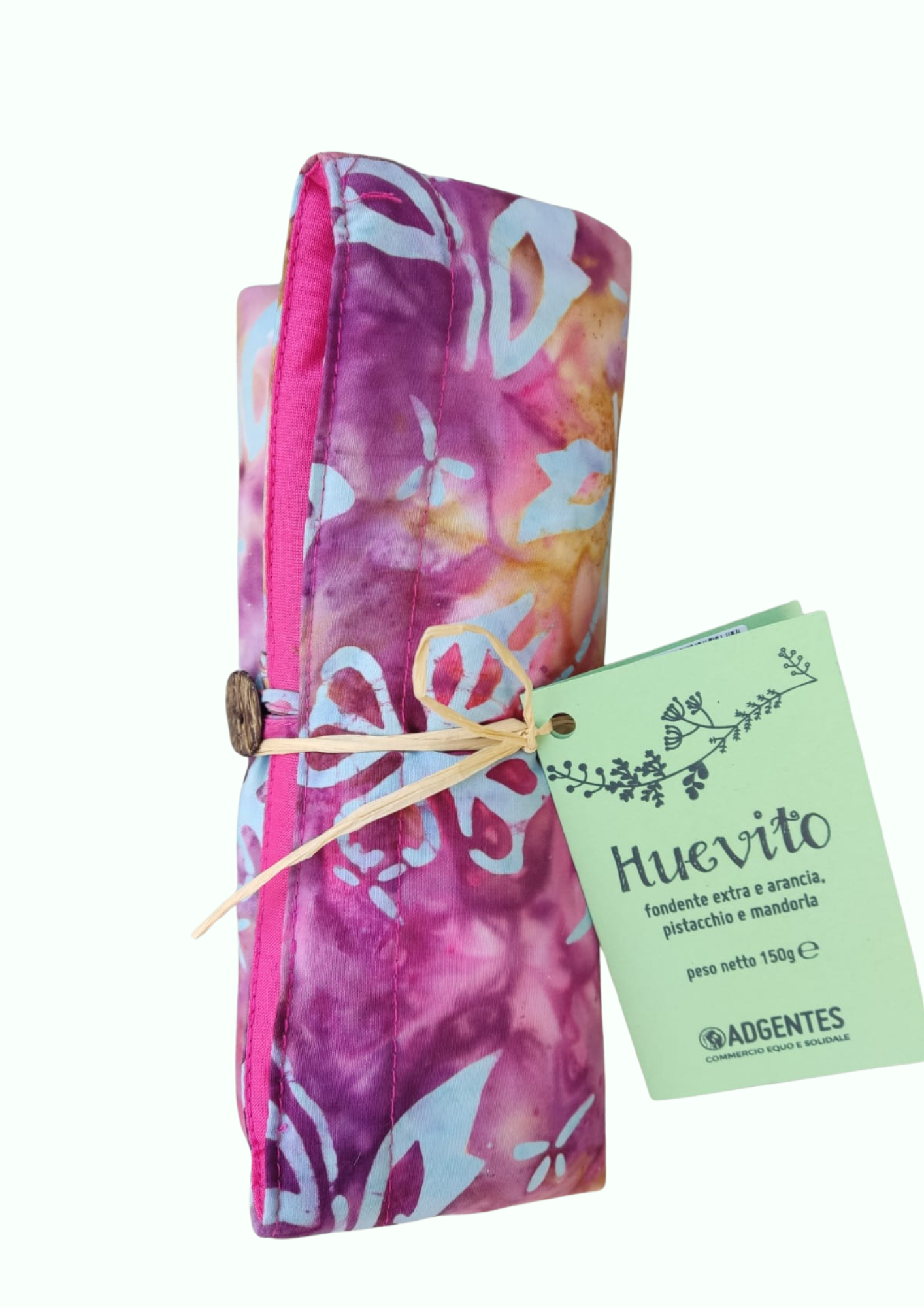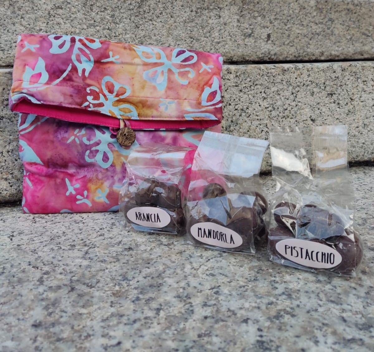Borsetta batik con tris di ovetti (3x50g) gusto fondente bergamotto, fondente fiori di arancio, latte nocciole.